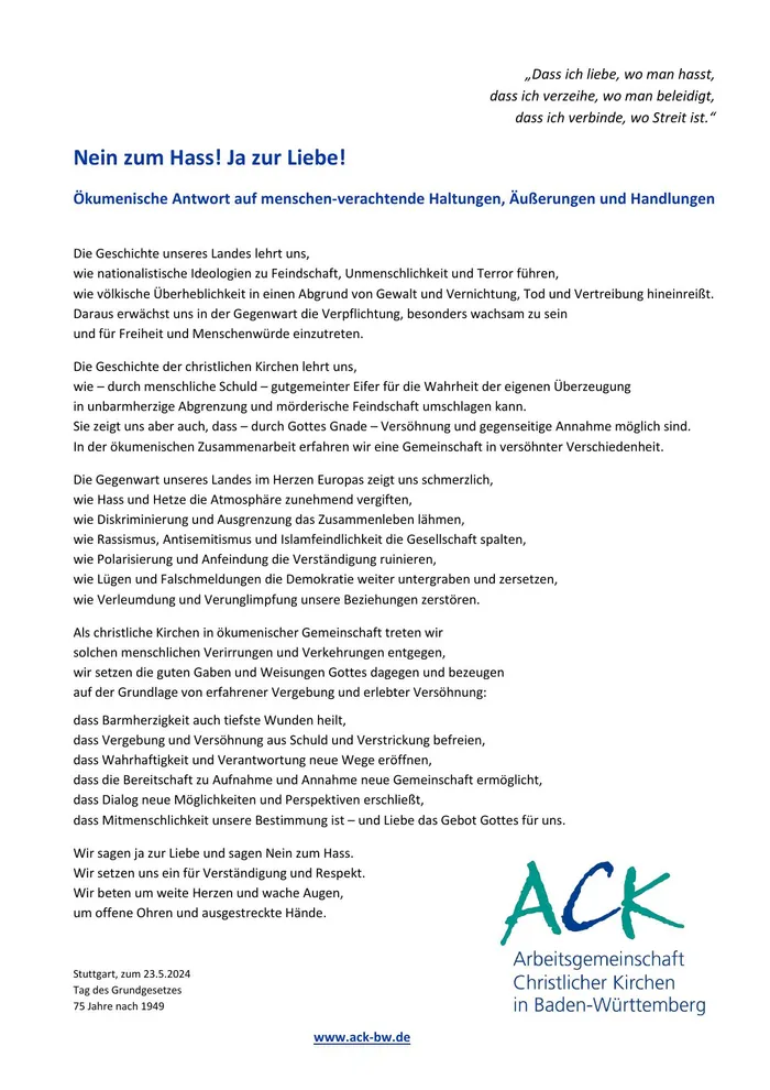 Sechsundzwanzig Kirchen und kirchliche Gemeinschaften arbeiten in der »Arbeitsgemeinschaft Christlicher Kirchen in Baden-Württemberg« (ACK) zusammen. Fundament dafür sind die Bibel und das Glaubensbekenntnis von Nizäa-Konstantinopel.